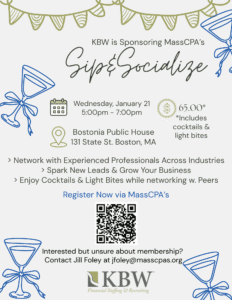 Coming up next week, KBW Financial Staffing & Recruiting is a sponsor of the MassCPA’s Sip & Socialize. The perfect midweek excuse to step away from your desk and enjoy a night of great conversation.